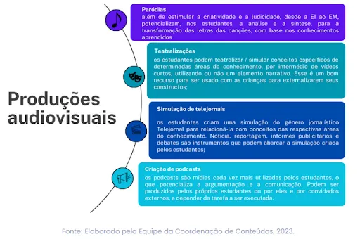 Tais produções proporcionam aos estudantes o desenvolvimento de diversas habilidades, como a comunicação, a síntese e a cultura digital. Pode-se criar uma rubrica geral que contemple toda e qualquer produção audiovisual elaborada pelos estudantes ou, então, criar rubricas específicas. As produções audiovisuais podem ser categorizadas: